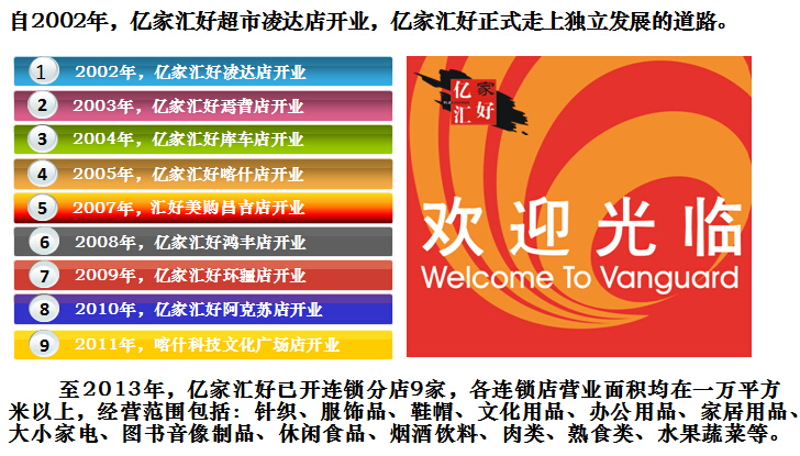 億家匯好商貿(mào)有限責任公司于2002年成立,并從臺灣引進連鎖經(jīng)營職業(yè)管理團隊,統(tǒng)一管理旗下各地的連鎖超市。公司通過多年的穩(wěn)健發(fā)展,至2013年底,億家匯好商貿(mào)有限責任公司已成為擁有員工近3000多人,下轄一個配送中心和9家連鎖超市的大型綜合性零售企業(yè)。總經(jīng)營面積11萬多平方米,配送中心輻射公司所有超市,年配送額可達2億元。公司大量吸納下崗職工,經(jīng)過崗前培訓(xùn),提高勞動技能,實現(xiàn)了他們的再就業(yè),為維護社會和諧穩(wěn)定做出了貢獻。2013年,巴州億家匯好商貿(mào)有限責任公司在自治區(qū)零售業(yè)中穩(wěn)踞前三位,是自治區(qū)重要的流通龍頭企業(yè),2013年年銷售收入達10億人民幣。多年來,公司一直重管理、抓實效、運用先進的管理手段和營銷理念,秉承億家匯好人 時時尋求效率創(chuàng)新,事事講究專業(yè)技術(shù)的文化精髓,創(chuàng)造了良好的經(jīng)濟效益和社會效益。公司先后多次被消費者協(xié)會評為誠信單位,并多年被評為重合同,守信用單位。
